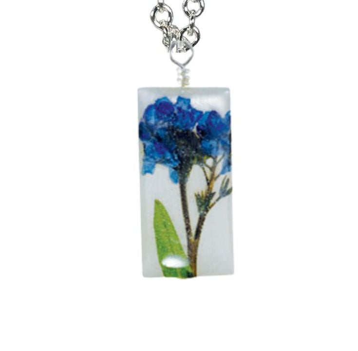 Genuine Forget Me Not Flowers set on actual hammer shell (the inside of an oyster shell) and finished with a thick coat of resin. Pendant is 15mm x 10mm and Sterling Silver plated brass chain measures 16" plus extension.